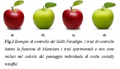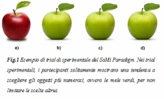 Nelle 12 sequenze di immagini, chiamate ‘sperimentali’, tutti gli oggetti presentati sono uguali tra loro fatta eccezione di uno, che ad esempio può essere di colore diverso. Al partecipante, ad esempio, viene presentata una sequenza di quattro mele: tre di colore verde e una soltanto di colore rosso (si veda fig.1). A queste sequenze, ne sono mescolate altre 12 definite di ‘controllo’ con oggetti multipli fra loro, per non rendere del tutto esplicito l’intento dello studio (si veda fig. 2).